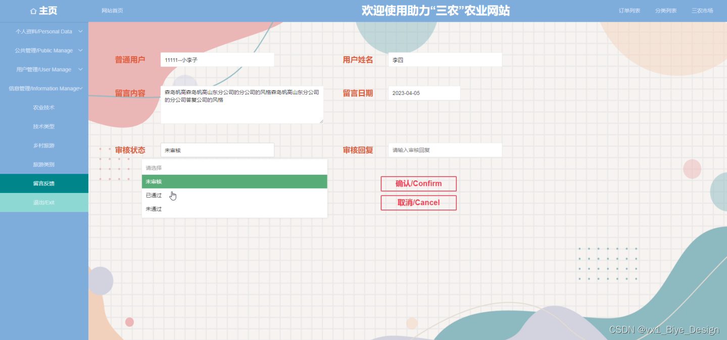 The database used by this SSM to assist the "agriculture, rural areas, and farmers" agricultural website is MySQL, developed using the SSM framework. During the design process, the system code was fully guaranteed to have good readability, practicality, scalability, universality, ease of later maintenance, easy operation, and concise pages.