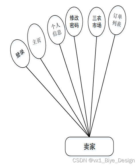 (3)卖家:主页、个人资料(个人信息、修改密码)三农市场、订单列表等功能模块。卖家用例图如图3-3所示。