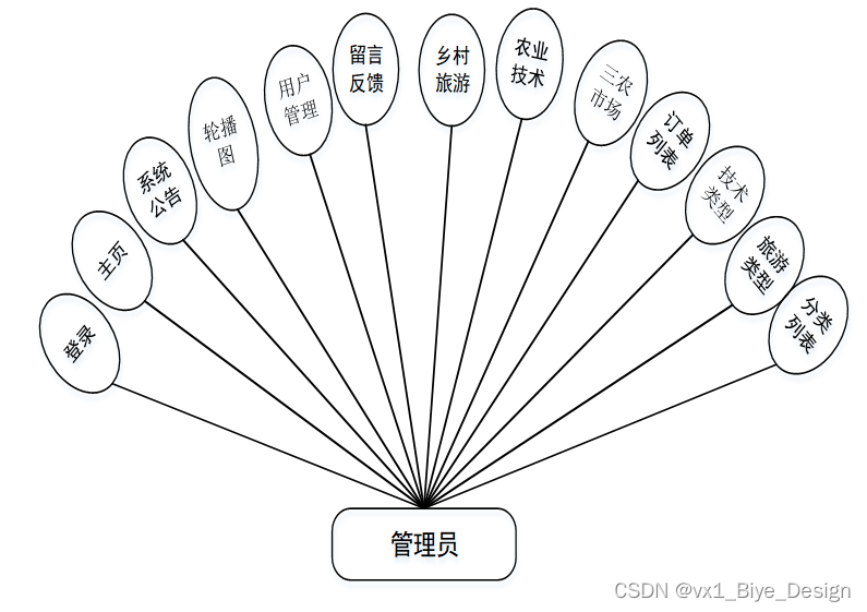 (1)管理员模块:系统中的核心用户是系统管理员,管理员登录后,通过管理员菜单来管理后台系统。主要功能有:主页、公共管理(轮播图、系统公告)、用户管理(普通用户、卖家、管理员)信息管理(新闻列表、新闻分类列表)农业技术、乡村旅游、技术类型、旅游类型、分类列表、三农市场、订单列表、留言反馈等功能模块。管理员用例图如图3-1所示。