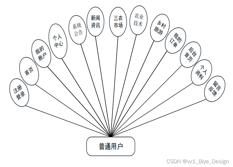 (2)普通用户:首页、系统公告、新闻资讯、三农市场、农业技术、乡村旅游、我的(我的账户、我的收藏、个人中心、我的订单、我的购物车)后台首页:个人资料(个人信息、修改密码)留言反馈等功能模块。普通用户用例图如图3-2所示。