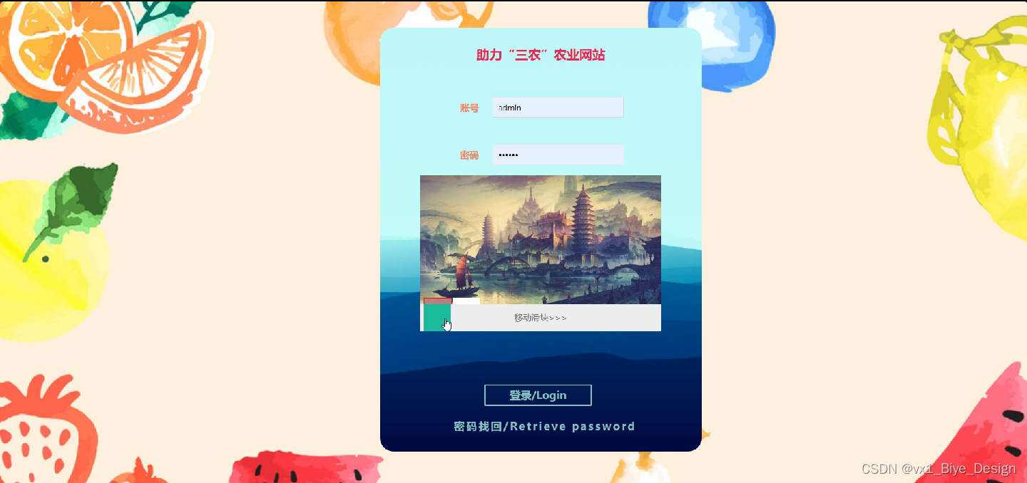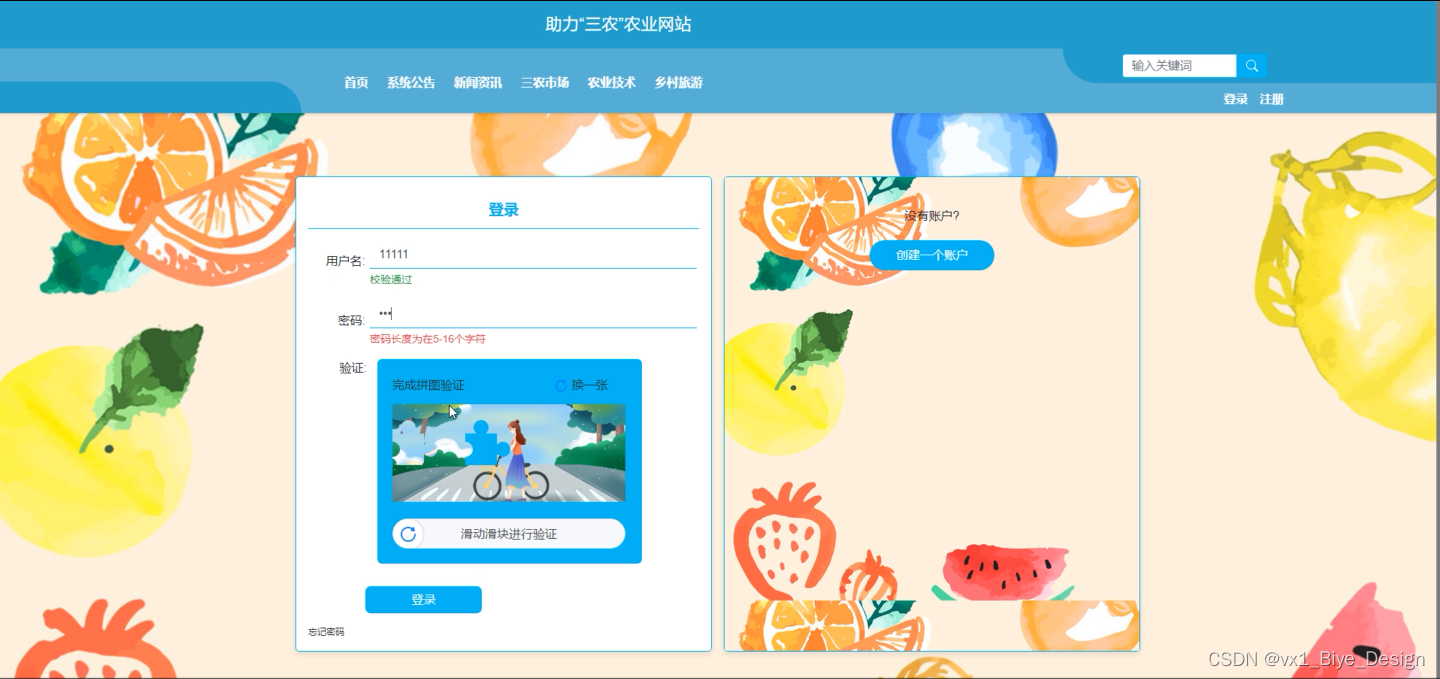 助力“三农”农业网站,在系统登录页面卖家填写账号、密码等信息滑动滑块进行验证登录,如图5-16所示。
