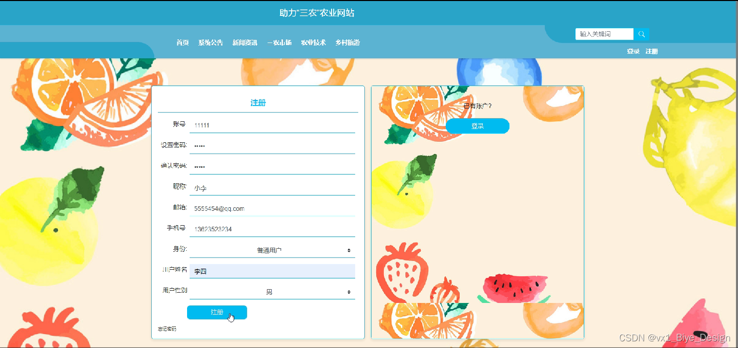 不是助力“三农”农业网站中正式用户的是可以在线进行注册的,如果你没有本助力“三农”农业网站的账号的话,添加“注册”,当填写上自己的账号+密码+确认密码+昵称+邮箱+手机号+身份+用户姓名+用户性别等信息后再点击“注册”按钮后将会先验证输入的有没有空数据,再次验证密码和确认密码是否是一样的,最后验证输入的账户名和数据库表中已经注册的账户名是否重复,只有都验证没问题后即可用户注册成功。注册成功后在登录页面输入用户名、密码、图片验证进行登录,如图5-8 5-9所示。