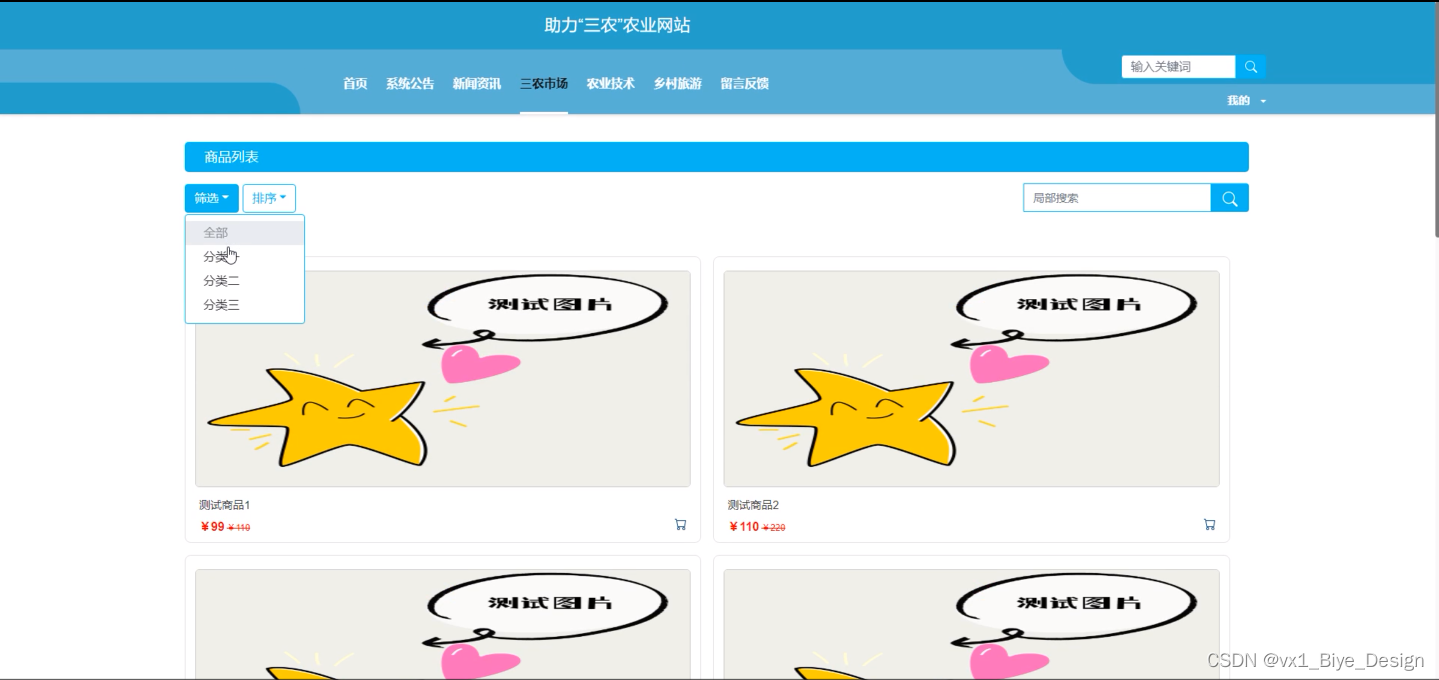 三农市场:用户在此页面可通过筛选等方式搜索查看商品信息,如:商品图片、原价、卖价、商品规格等详细信息,对喜欢的商品可进行收藏、加入购物车或立即购买等操作,如图5-12所示。