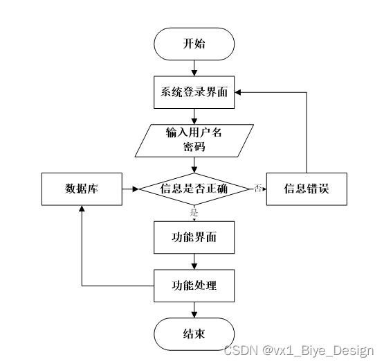 用户打开并进入系统后,会先显示登录界面,输入正确的用户名和密码,系统自动检测信息,若信息无误,则用户会进入系统功能界面,进行操作,否则会提示错误无法登录,操作流程如图3-3所示。