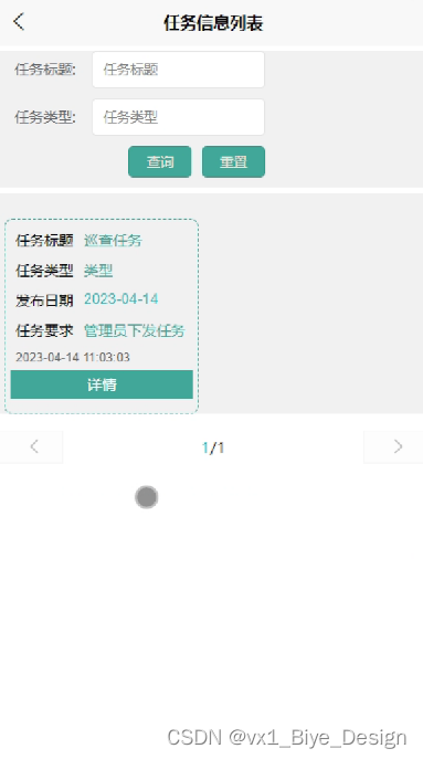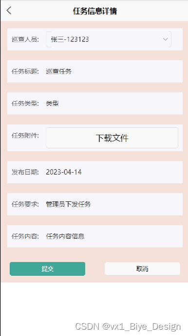 任务信息,在任务信息页面可以查看管理员下发的任务信息,包括任务标题,类型,发布日期,任务要求,任务内容等信息,可以进行详情查看,任务附件下载等操作。如下图所示。