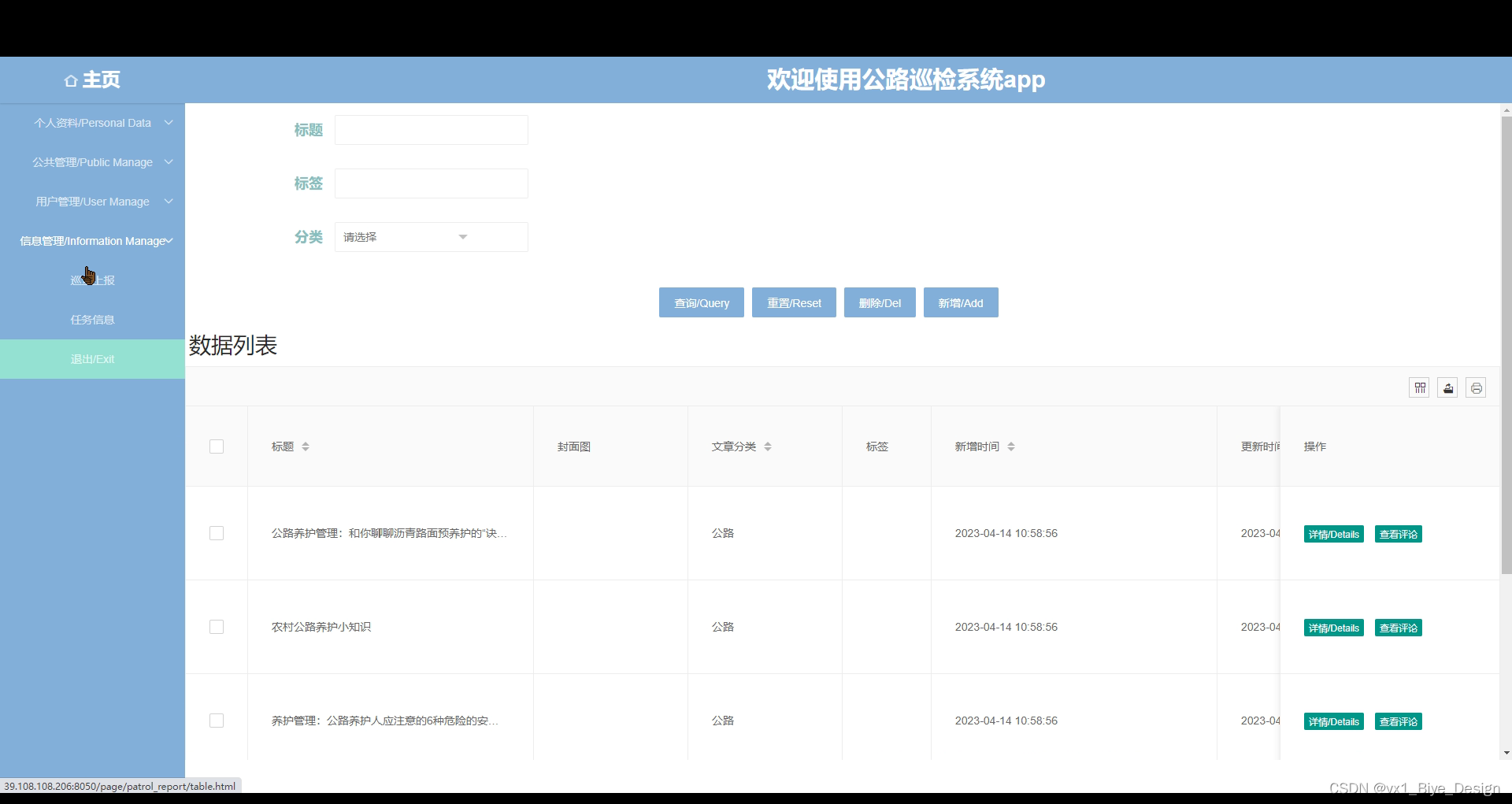 公路资讯管理,管理员在此页面可以查看公路资讯,包括标题,图片,标签,分类,描述,正文等信息,可以进行查询,修改,新增,删除等操作,如下图所示。