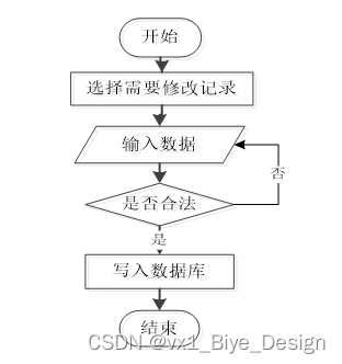 管理员可以对信息等进行的修改,用户也可以对自己权限内的信息进行修改,首先进入修改信息界面,输入修改信息数据,系统进行数据的判断验证,修改信息合法则修改成功,信息更新至数据库,信息不合法则修改失败,重新输入。修改信息流程图如图3-5所示。