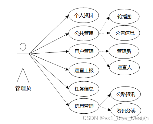 系统中的核心用户是系统管理员和巡查人,管理员登录后,通过管理员菜单来管理后台系统。主要功能有:主页,个人资料,公共管理(轮播图,公告信息),用户管理(管理员,巡查人),信息管理(公路资讯,资讯分类),巡查上报,任务信息等功能。管理员用例如图3-7所示。
