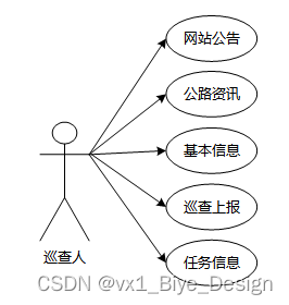 系统用户为巡查人,进入系统可以进行首页,网站公告,公路资讯,我的(基本信息,巡查上报,任务信息)等查询、操作,用户用例如图3-8所示。