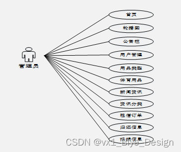 (3)确定好系统使用的技术,进行在线确认系统所划分的用户角色,并且根据用户角色划分确定所要设计的功能模块,对于微信小程序的面向高校校园体育用品租借管理系统系统的设计主要划分别为管理员和用户角色,并所使用的功能模块也相应不同,但是系统的数据库实现的内容是交互的,用户可以随时根据自己的需求进行课程信息,对于系统工作人员可以根据自己的分管内容进行在线信息的处理及操作,管理员获取到所有用户的详细数据信息,并根据需求进行第一时间处理解决。