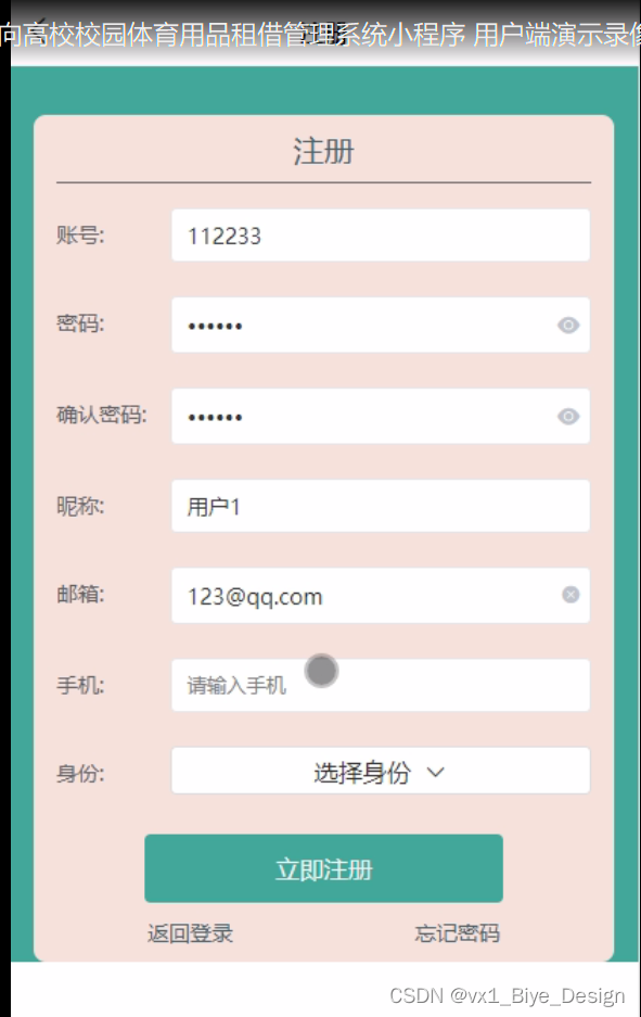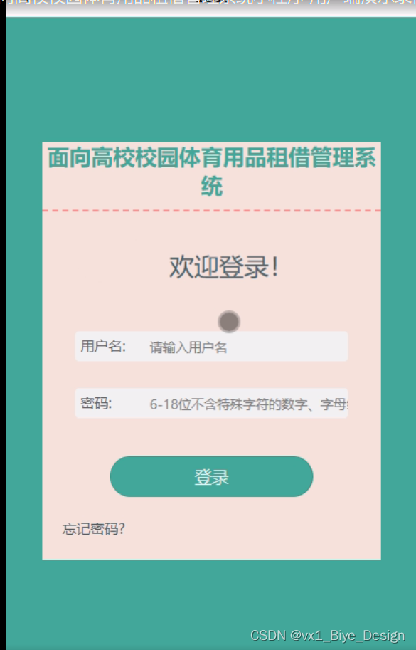 微信小程序的面向高校校园体育用品租借管理系统登录界面,通过填写账号、密码、等信息进行登录,如图5-1所示。