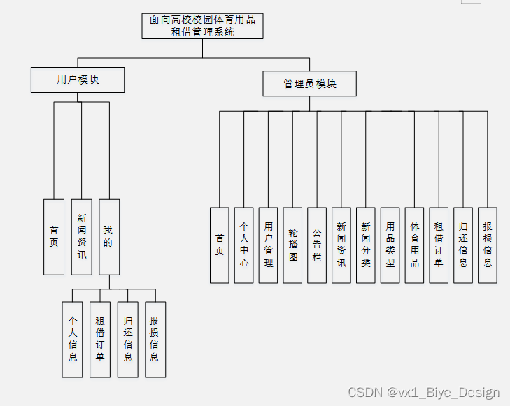基于微信小程序的面向高校校园体育用品租借管理系统基于现有的手机,可以实现管理员:首页、轮播图、公告栏、资源管理(新闻资讯、新闻分类)系统用户(管理员、普通用户)模块管理(用品类型、体育用品、租借订单、归还信息、报损信息)等详细的了解及统计分析。根据系统功能需求建立的模块关系图如下图:
