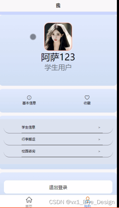 我的,在我的页面可以查看个人中心、学生信息、行李搬运、校园咨询等详细信息,如图5-6所示。