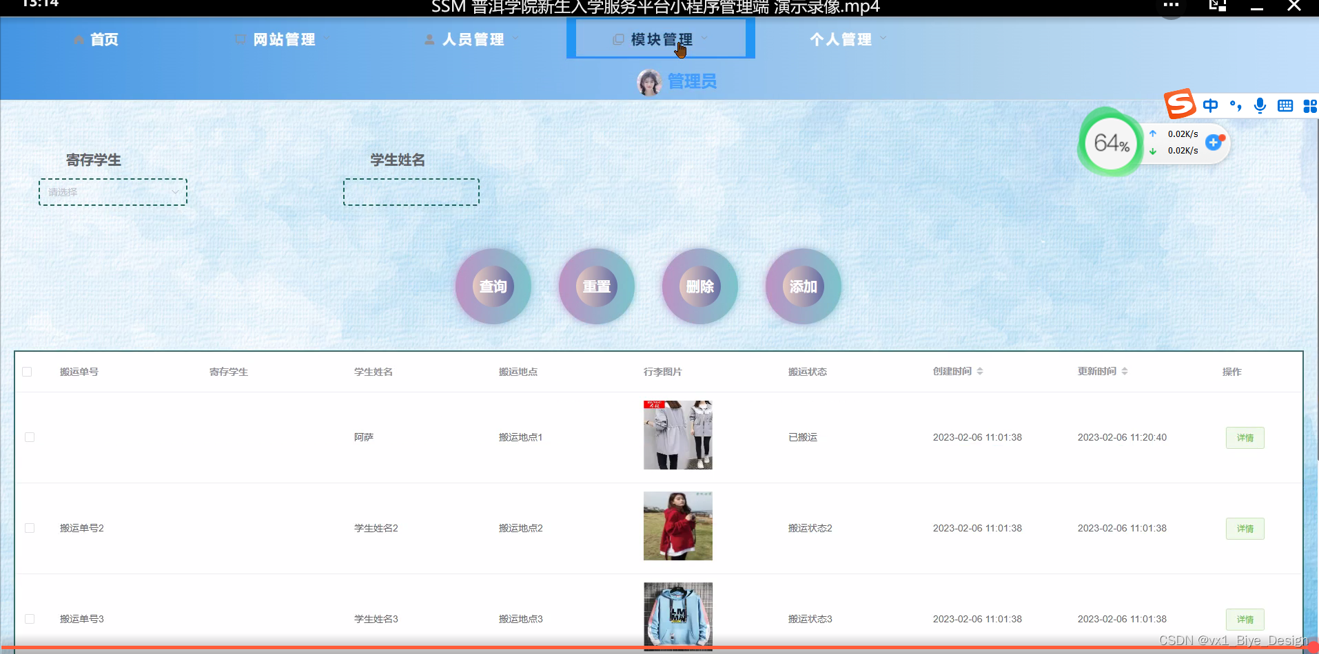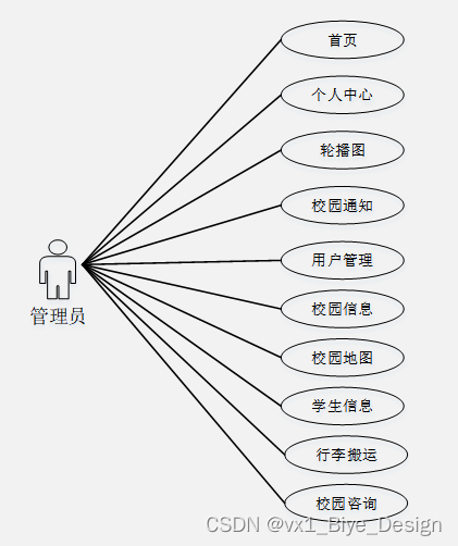 在管理员功能页面可以查看首页、网站管理(轮播图、校园通知)人员管理(管理员、学生用户、工作人员)模块管理(校园信息、校园地图、学生信息、行李搬运、校园咨询)个人管理、系统管理等内容进行相对应操作,如图5-10所示。