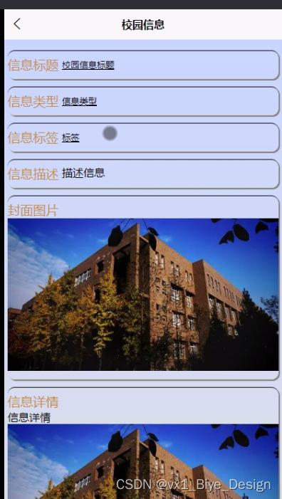 校园信息,在校园信息页面可以查看信息标题、信息类型、信息标签、信息描述、封面图片等信息,如图5-4所示。