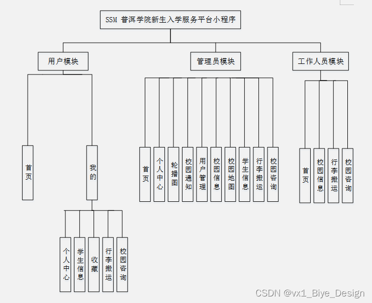 基于普洱学院新生入学服务平台小程序的设计基于现有的手机,可以实现首页、网站管理(轮播图、校园通知)人员管理(管理员、学生用户、工作人员)模块管理(校园信息、校园地图、学生信息、行李搬运、校园咨询)个人管理等功能。方便用户对首页、我的(个人信息、收藏、学生信息、行李搬运、校园咨询)等详细的了解及统计分析。根据系统功能需求建立的模块关系图如下图:
