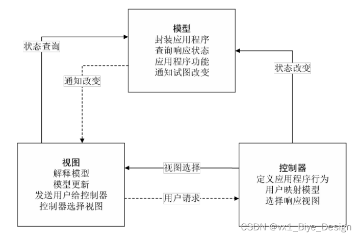 MVVM 就是将其中的View 的状态和行为抽象化,让我们将视图 UI 和业务逻辑分开。当然这些事 ViewModel 已经帮我们做了,它可以取出 Model 的数据同时帮忙处理 View 中由于需要展示内容而涉及的业务逻辑。它强制性的把应用程序的输入、输出和处理全部分开,将其分为三个核心部分,这三个部分分别有不同的功能。