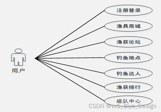钓鱼分享平台基于现有的网络开发,可以实现管理员,用户管理(管理员、用户注册)公告管理(平台公告发布)交流管理(渔获论坛、论坛分类)商城管理(渔具商城、分类列表、订单列表)模块管理(钓鱼地点、钓鱼达人、渔获排名、组队中心、入队申请)等详细的了解及统计分析。实现用户:首页、公告浏览、渔获论坛、渔具商城、钓鱼达人、钓鱼地点、渔获排行、组队中心,根据系统功能需求建立的模块关系图如下图: