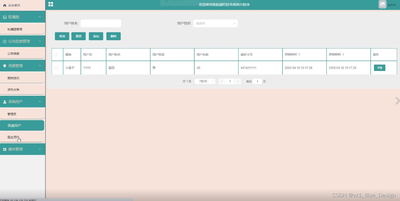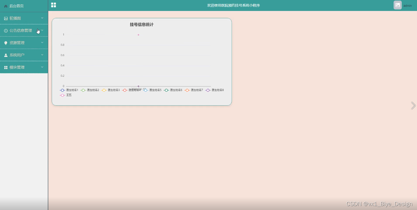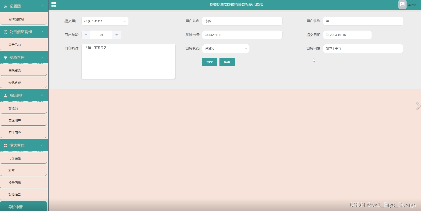 在管理员功能页面可以查看个人资料、轮播图、公告资源管理、资源管理(医院资讯、资讯分类)、系统用户、模块管理(门诊医生、科室、挂号信息、取消挂号、导诊申请)等内容进行相对应操作,如下图所示。