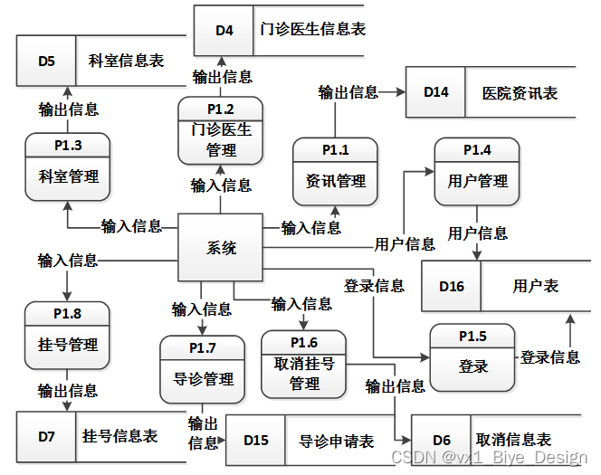 二层数据流程是对一层数据流层图中填写登录注册信息、用户功能的细化。即:填写登录注册信息细化为填制信息、后台审核,用户功能细化为导诊申请、医院资讯查看、通知查看等操作。