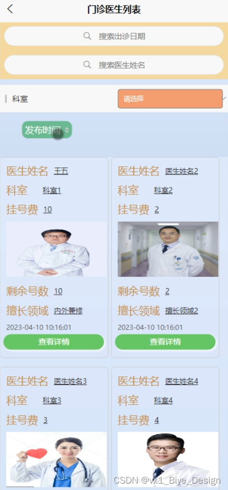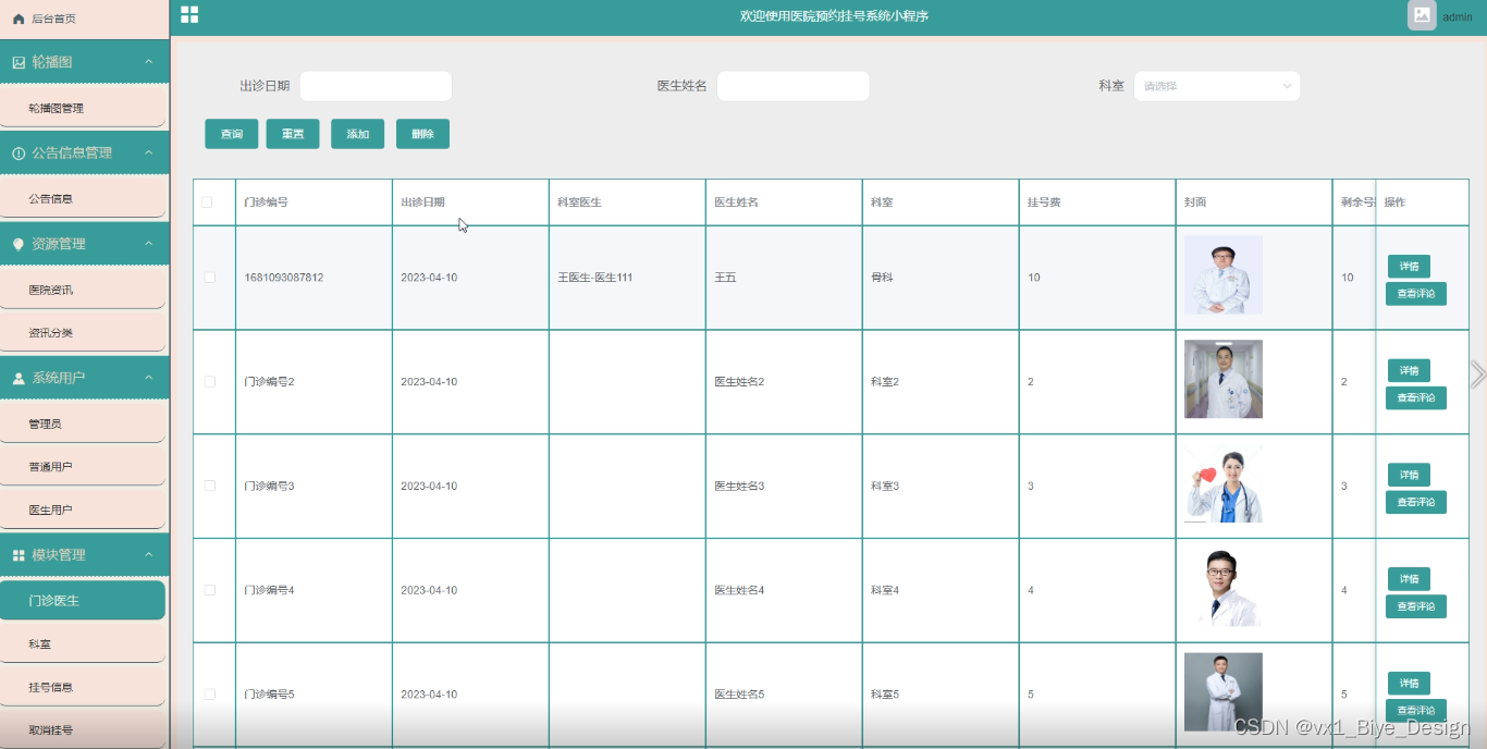 用户点击门诊医生页面,可以看到各个科室的门诊医生信息,包括医生姓名、科室、挂号费等,也可以对门诊医生信息进行点赞、收藏、发表评论等操作。