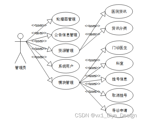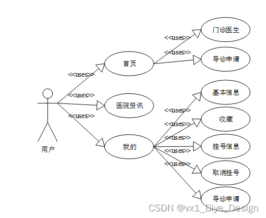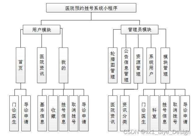 医院预约挂号小程序在对需求做解析后,整个系统主要分为两个部分:管理员和用户,每个模块下的分支功能不一样。对功能做出如下说明: