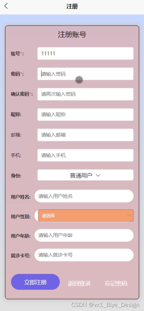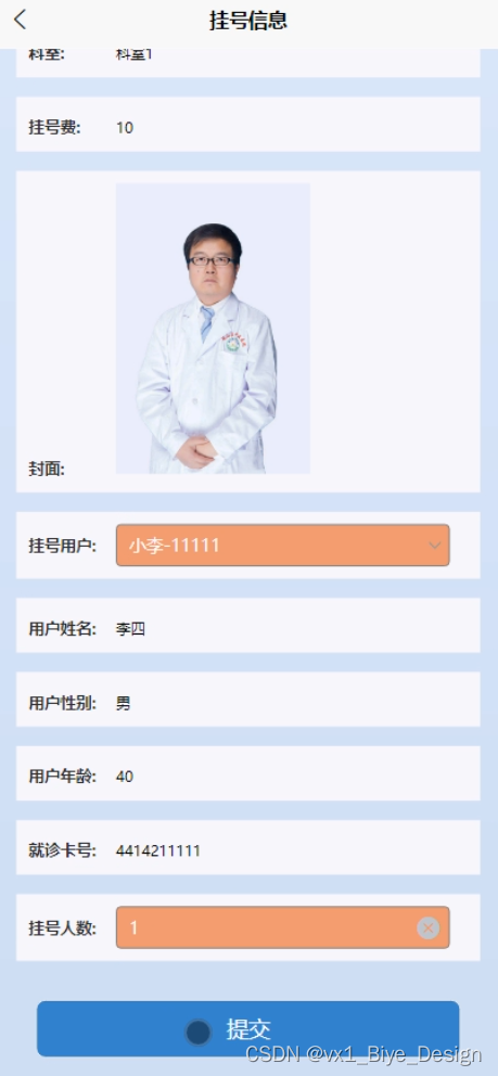 用户点击预约挂号页面,填写信息,包括用户名、年龄、性别、就诊卡号、挂号任人数等,点击提交,用户可查看历史挂号信息数据。
