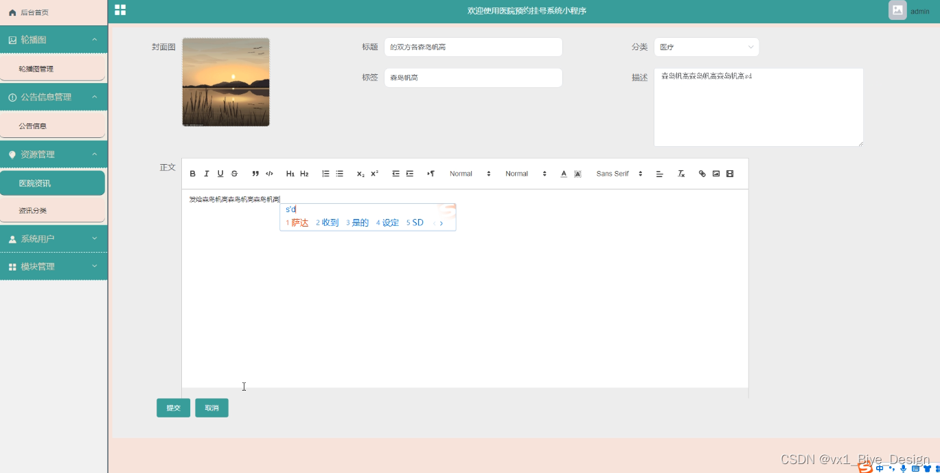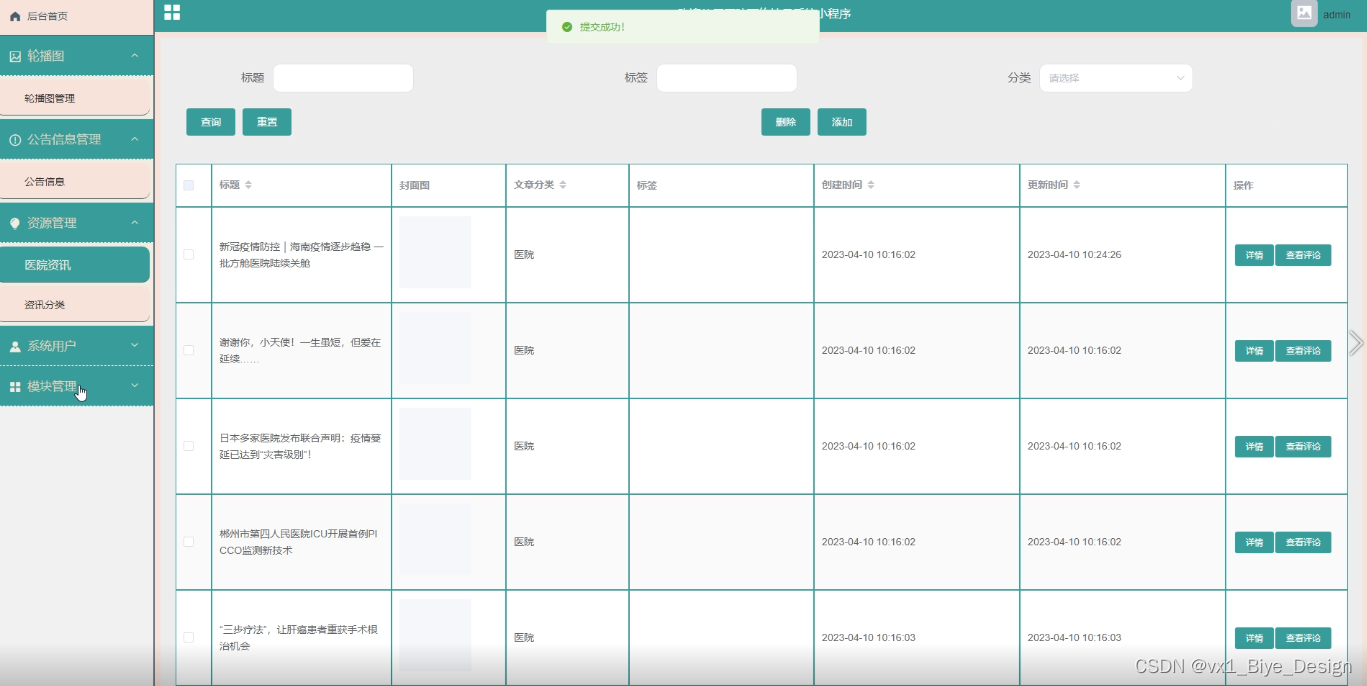 资源管理,分为医院资讯和资讯分类。医院资讯信息由管理员进行修改、添加、删除操作。