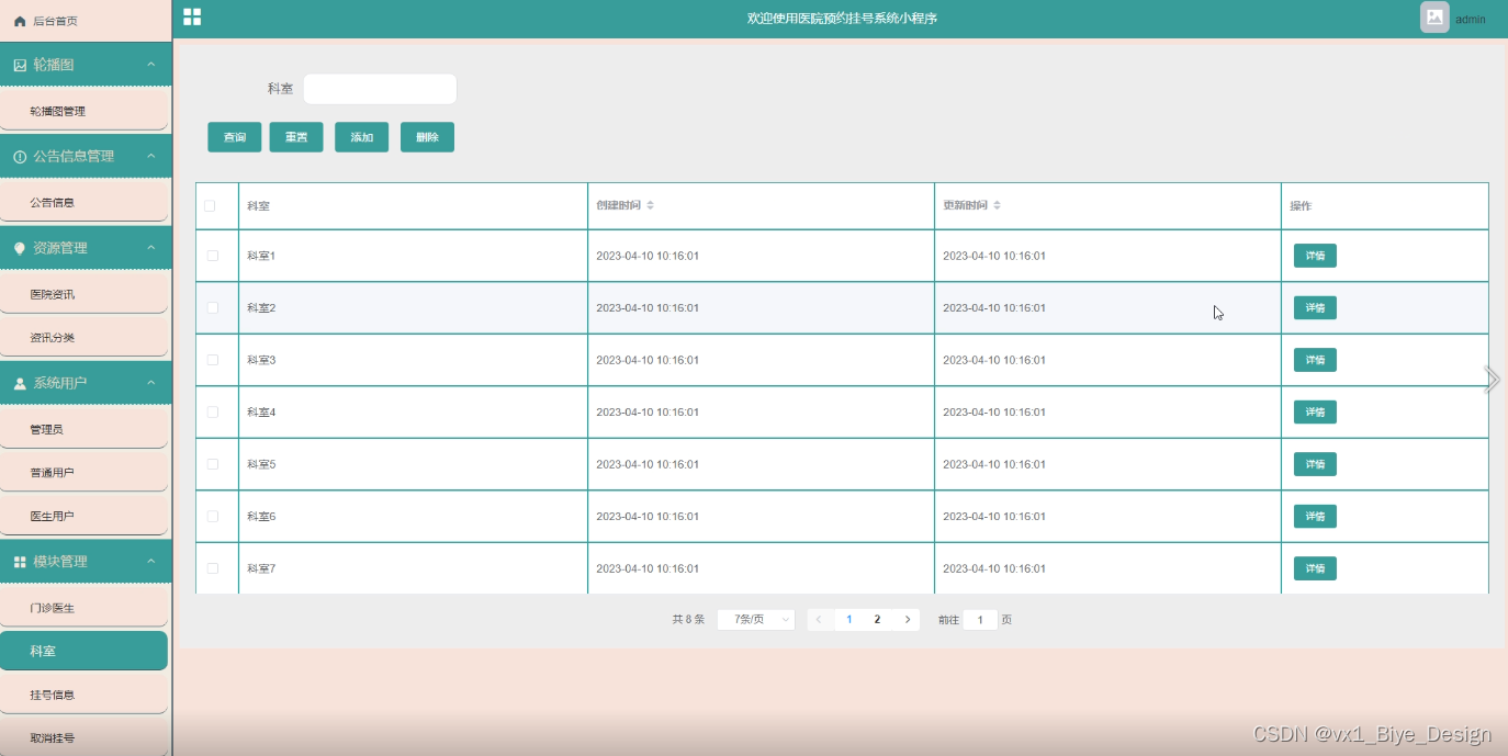 发布科室,并可以销毁某个科室,更新科室数据,模糊搜索科室数据等。