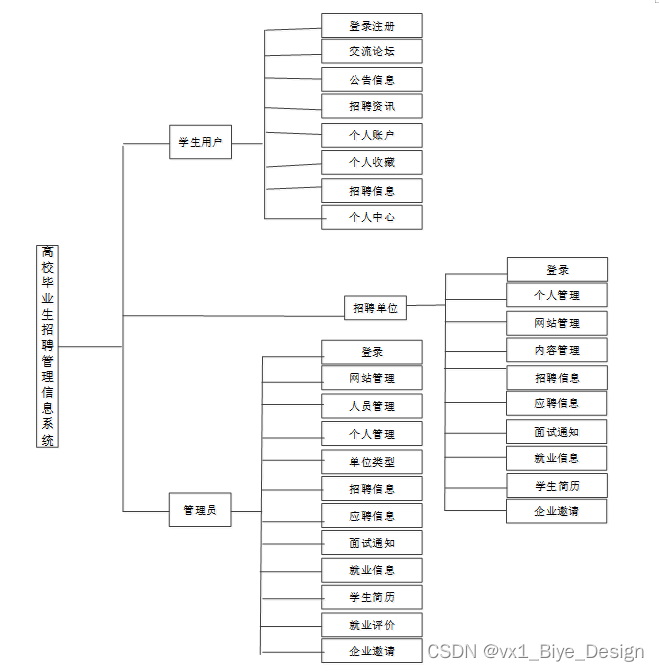 高校毕业生招聘管理信息系统从角色上划分为了学生用户、招聘单位、管理员三种角色。