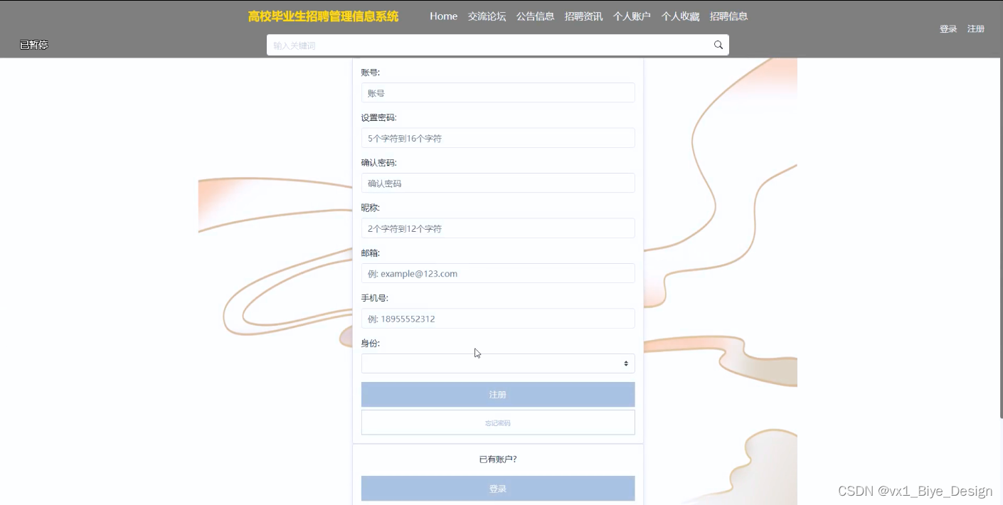 (1)注册登录模块:当学生用户想要进入本高校毕业生招聘管理信息系统中对资讯进行查看评论以及了解招聘信息等操作的时候,就必须要登录到系统当中,要是新的用户没有高校毕业生招聘管理信息系统的账号的话,点击“注册”按钮,就会进入到新用户注册这个界面上,用户输入对应的账号(必须填写)+密码(必须填写)+确认密码(必须填写,而且要与密码一直)+昵称+邮箱+手机号+选择用户身份等等,然后点击“注册”,系统在用户这一数据库中会查询账号是不是存在,两次密码是不是一样,都填写正确就会注册成功,然后再进行登录,如果是之前已经注册过的用户很长时间没有使用,忘记密码,也可以点击“忘记密码”进行找回;