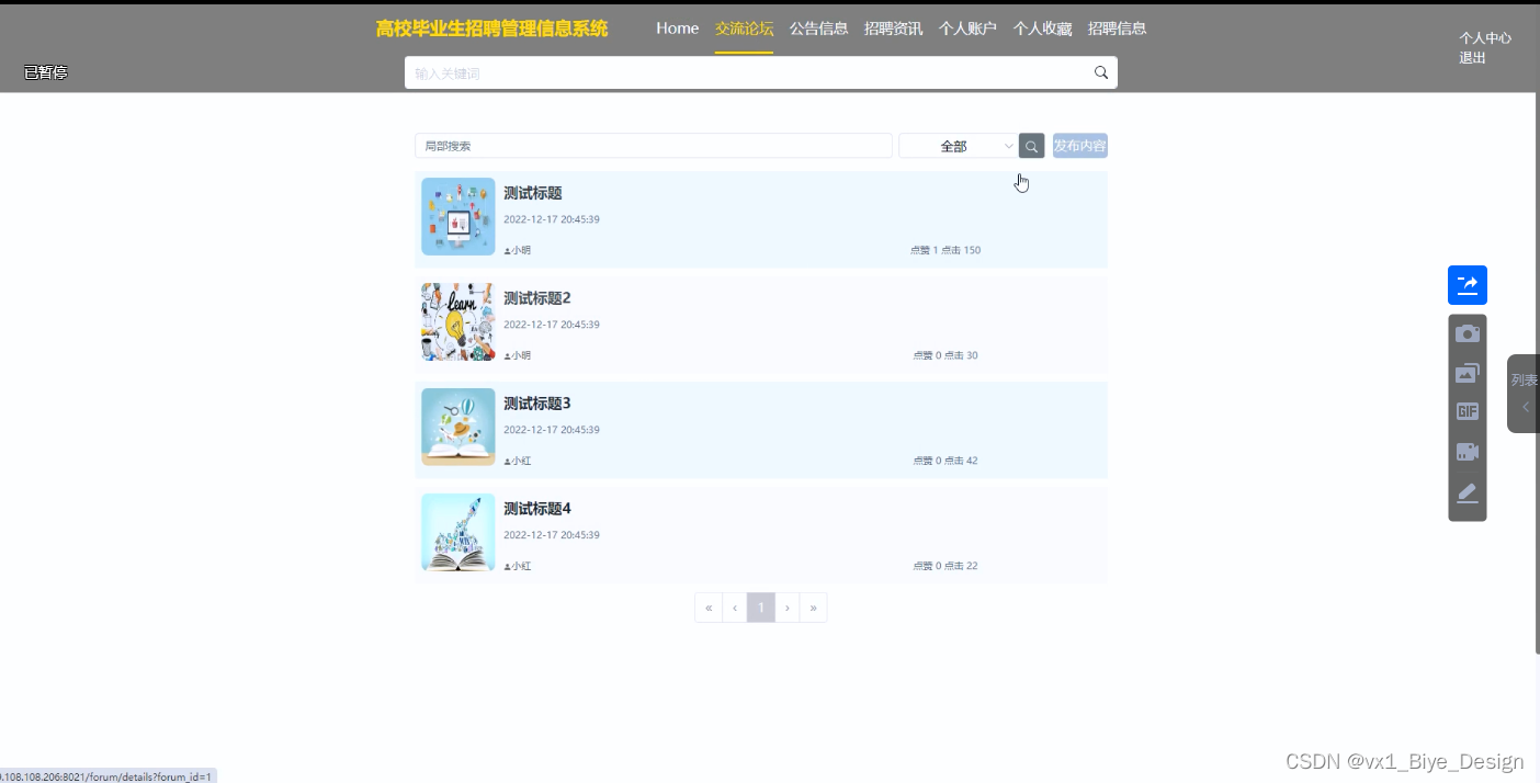 (2)招聘资讯:在首页导航栏上我们会看到“招聘资讯”这一菜单,我们点击进入进去以后,会看到所有资讯列表,在这个界面,我们可以点击进入进行查看、评论、点赞等;