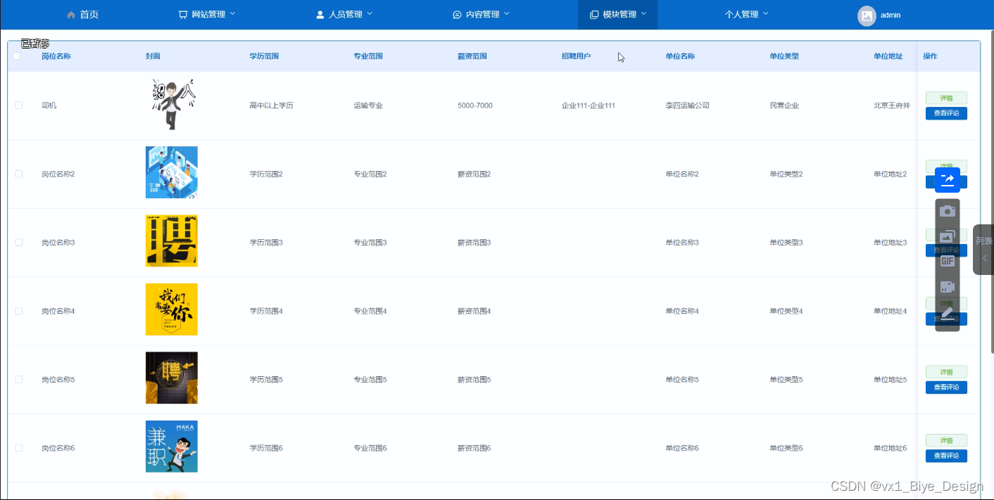 此功能为管理员的功能,管理员点击“招聘信息”菜单后能够对招聘信息进行增删改查操作;其界面展示如下图4.13所示。