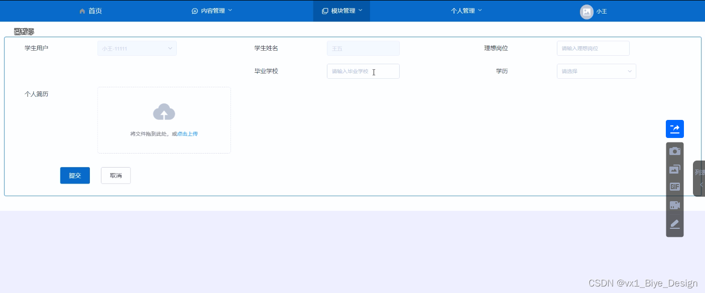 (3)表student_resume实体用来存放系统中管理员添加的学生简历,学生简历表包含了学生用户、学生姓名、学生头像、理想岗位、毕业学校、学历、个人简历等信息;