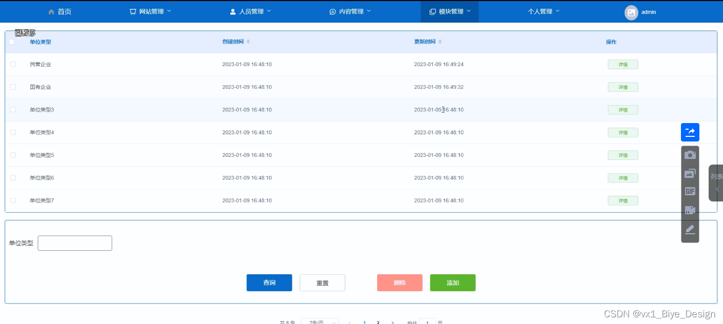 此功能为管理员的功能,管理员点击“单位类型”菜单后,会展示出添加单位类型栏,可以对单位类型信息进行增删改查操作;其界面展示如下图4.12所示。