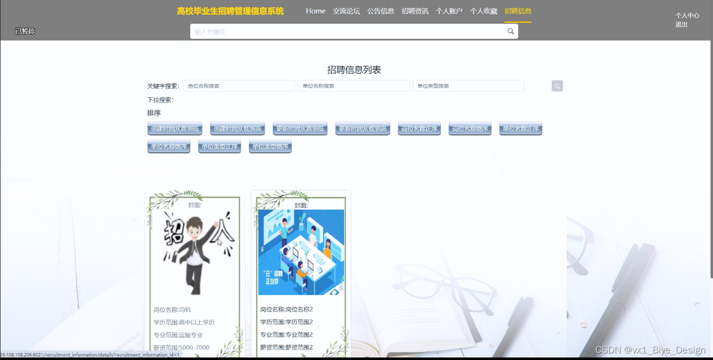 (5)招聘信息:在首页导航栏上点击“招聘信息”弹跳出的是招聘信息列表,可以点击随意一款招聘信息进行了解其具体信息。包括岗位名称、学历范围、专业范围、薪资范围等;