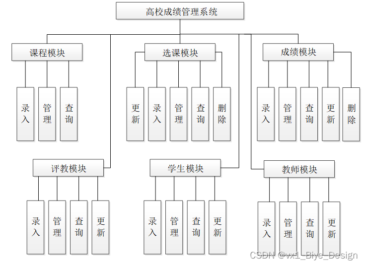 高校成绩管理系统在对需求做解析后,整个系统主要分为三个部分:管理员和教师、学生,每个模块下的分支功能不一样。对功能做出如下说明: