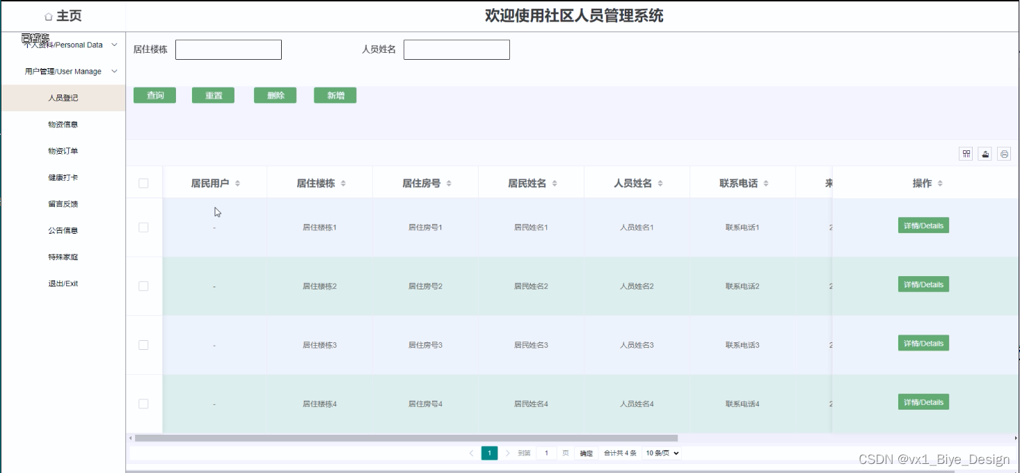 (4)人员登记:管理员点击“人员登记”会显示出所有的人员登记信息,支持通过剧用户或者居住楼栋对人员登记进行查询,如果想要添加新的人员登记信息,点击“添加”按钮,输入相关信息,点击“提交”按钮就可以添加了,同时可以选择某一条人员登记信息,点击“删除”进行删除。