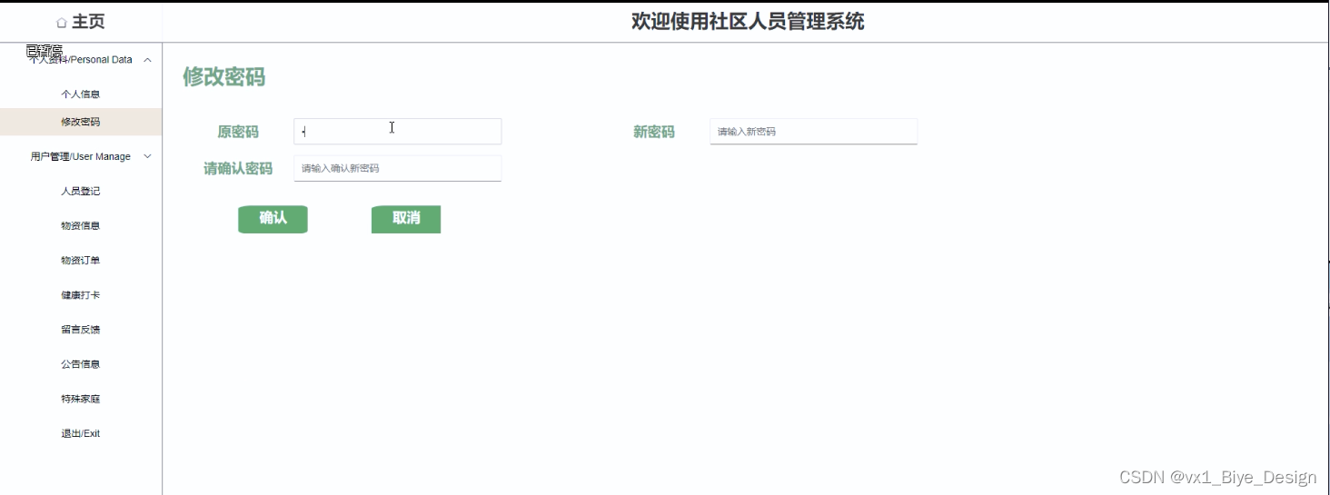 用户使用该社区人员管理系统注册完成后,用户对登录密码有修改需求时,系统也可以提供用户修改密码权限。系统中所有的操作者能够变更自己的密码信息,执行该功能首先必须要登入系统,然后选择密码变更选项以后在给定的文本框中填写初始密码和新密码来完成修改密码的操作。在填写的时候,假如两次密码填写存在差异,那么此次密码变更操作失败,下面的图片展示的就是该板块对应的工作面。界面如下图4.3所示。