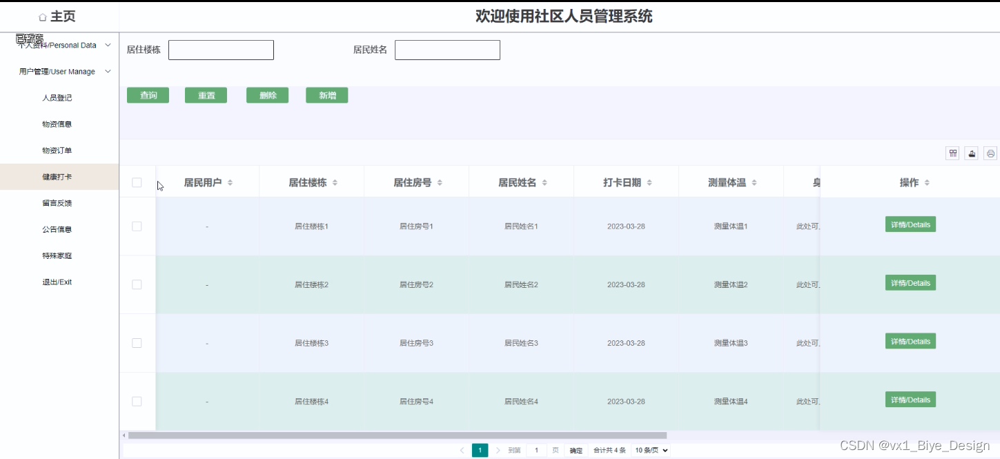 (3)健康打卡:点击“健康打卡”这个按钮可以查看到自己提交的所有的健康打卡信息,支持通过居民用户或者居住楼栋进行查询健康打卡信息,如果想要添加新的健康打卡信息,点击“添加”按钮然后根据提示输入健康打卡信息,点击“提交”后,在健康打卡界面就会显示新增的健康打卡信息,可以点击某一健康打卡信息查看健康打卡信息的详情;