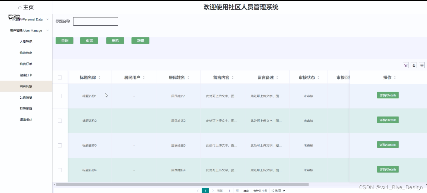 (4)留言反馈:点击“留言反馈”这个按钮可以查看到自己提交的所有的留言反馈信息,支持通过标题名称或者居民用户进行查询留言反馈信息,如果想要添加新的留言反馈信息,点击“添加”按钮然后根据提示输入留言反馈信息,点击“提交”后,在留言反馈界面就会显示新增的留言反馈信息,可以点击某一留言查看留言反馈信息的详情;