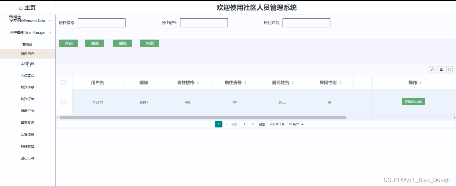 (2)人员登记:管理员点击“人员登记”会显示出所有的人员登记信息,支持通过剧用户或者居住楼栋对人员登记进行查询,如果想要添加新的人员登记信息,点击“添加”按钮,输入相关信息,点击“提交”按钮就可以添加了,同时可以选择某一条人员登记信息,点击“删除”进行删除。