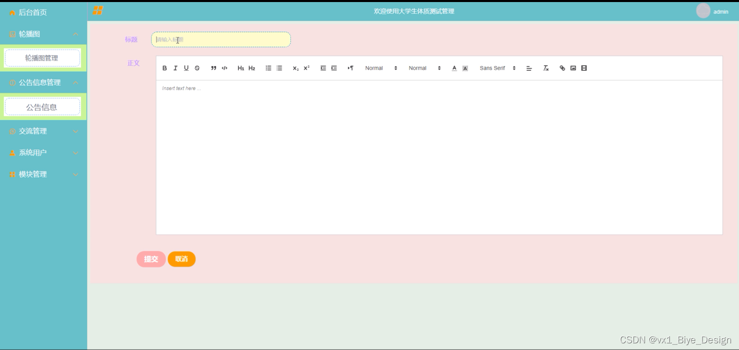 本文介绍了基于Java和SpringBoot框架开发的大学生体质测试管理系统,系统采用B/S结构,前端使用Vue.js,数据库选用MySQL。系统主要分为管理员和学生用户两大模块,实现了用户登录、个人信息管理、公告信息发布、目标信息和学习科普等内容。系统经过测试,确保了功能的正常运行和用户体验。