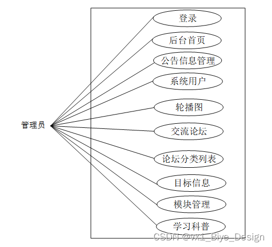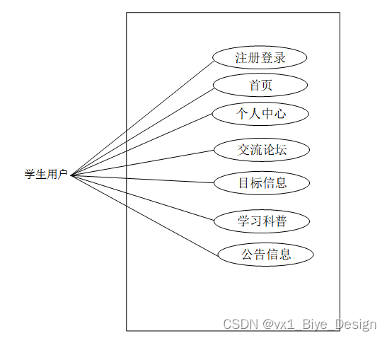 系统设计的目的是分析系统包括的所有功能结构,为开发人员设计开发和实现系统做好准备工作。经过前期的需求调查、分析和整理之后,确定的总体需求主要包括多个模块,分别是:后台首页、个人资料(个人信息、修改密码)、轮播图、公告信息管理、系统用户(管理员、学生用户)、交流管理(论坛列表、论坛分类列表)模块管理(目标信息、目标记录、学习科普、学习类别)。系统整体角色分为三个部分,一是学生用户、二是管理员。系统功能结构图如下图所示。