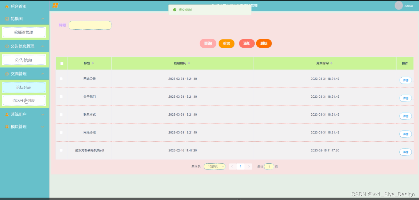 (3)交流管理:当点击“交流管理”这一菜单的时候,会出现论坛列表+论坛分类列表,这两个子菜单,能够对这两个模块进行增删改查等操作。