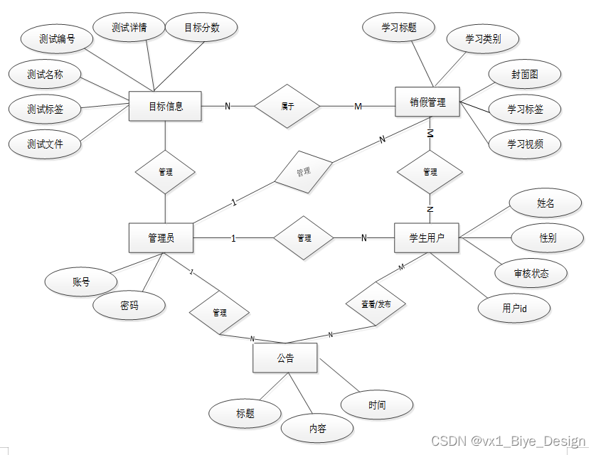 对于一个要开发的系统来说,E-R图可以让别人能更快更轻松的了解此系统的事务及它们之间的关系。根据系统分析阶段所得出的结论确定了在大学生体质测试管理 中存在着多个实体分别是用目标信息、目标记录、学习科普等。系统总体ER图如下图所示。