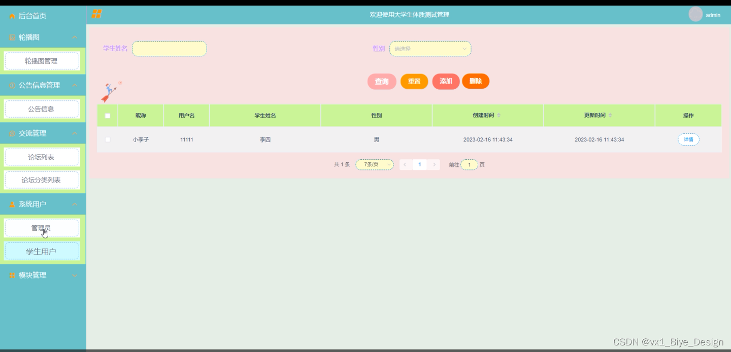 (2)系统用户管理:当点击“系统用户管理”这一菜单的时候,会出现管理员+学生用户两个子菜单,可以对这两个模块进行增删改查操作;