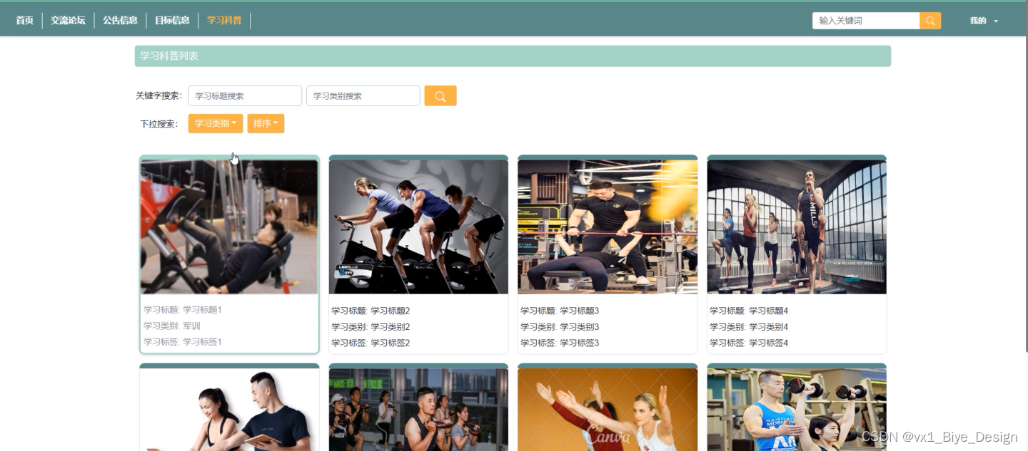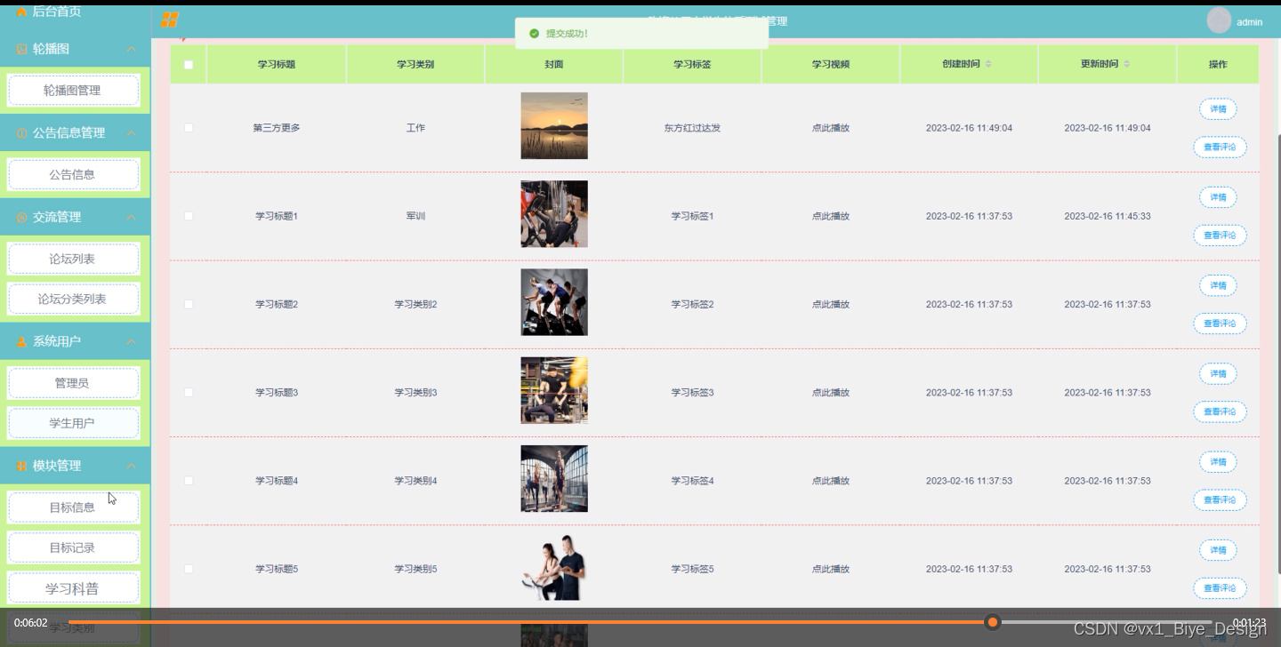 (4)模块管理:当点击“模块管理”这一菜单的时候,会出现目标信息+目标记录+学习科普+学习类别,这四个子菜单,能够对这四个模块进行增删改查等操作。