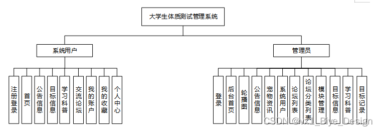 大学生体质测试管理 在对需求做解析后,整个系统主要分为两个部分:管理员、学生用户,每个模块下的分支功能不一样。对功能做出如下说明: