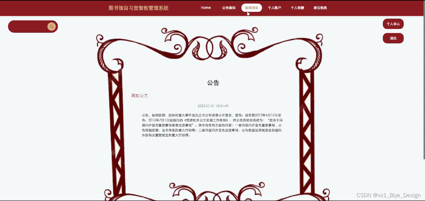 进入系统可以查看:首页,公告通知,新闻资讯,座位信息,个人账户,个人收藏,个人中心等功能,还可进行相应的操作,如图5-14所示。